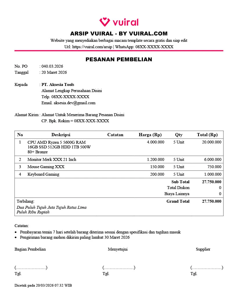 Anda hanya perlu mengganti data perusahaan, vendor, serta detail pesanan sesuai kebutuhan.